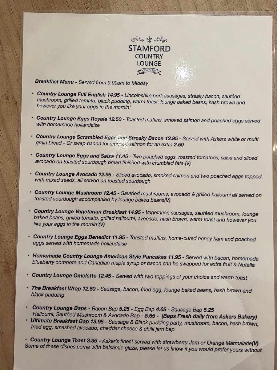 The menu at Stamford Country Lounge offers a range of food and drink options suitable for breakfast, light meals, and casual dining. It features a breakfast section with several traditional and contemporary dishes including the Full English Breakfast, Eggs Royale, Scrambled Eggs with Streaky Bacon, and various vegetarian selections such as Avocado and Mushroom dishes. There are also options like Eggs Benedict and American Style Pancakes to cater to diverse preferences.